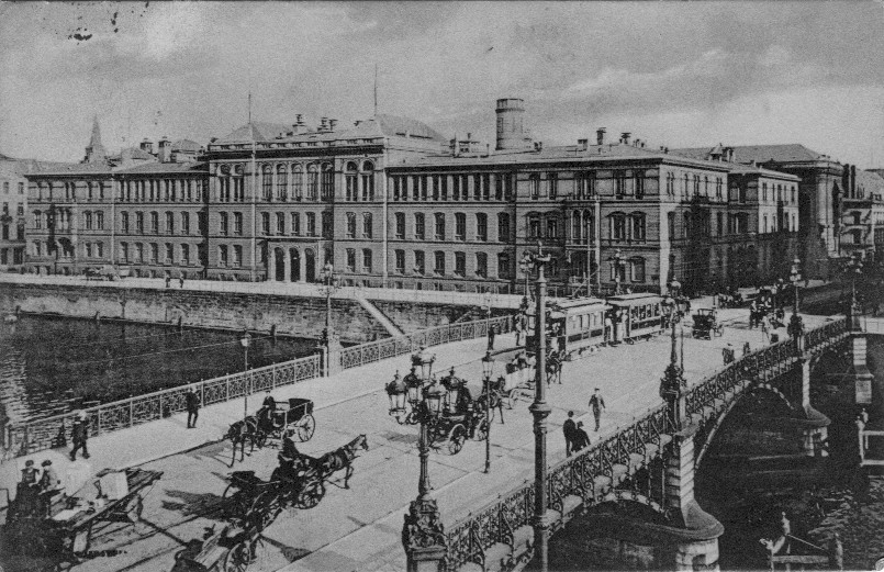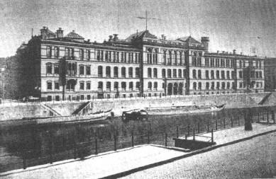 ARD-Hauptstadtstudio at the location of the old physical institute of 1877 at the Reichstagsufer, embankment of the river Spree (today the spelling is "Reichstagufer"). Before 1945 the name of the street was "Neue Wilhelmstraße" and also the numbering was different; Nernst lived at No. 16 when he was director of the physical institute.
