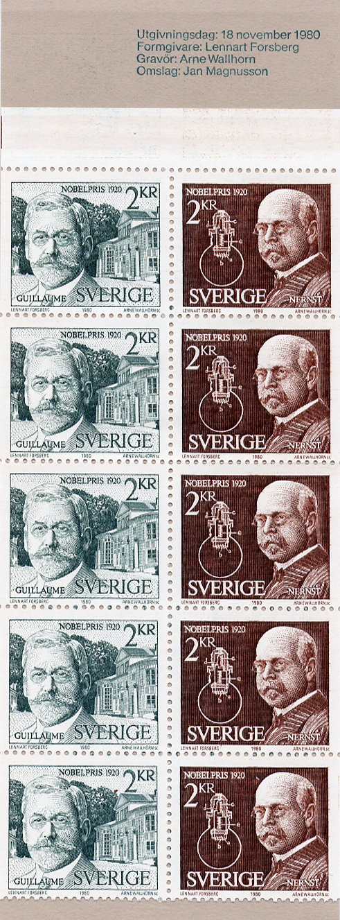 The stamp of Walther Nernst was sold together with a stamp of Charles-Edouard Guillaume (1920 Nobel Prize in Physics) in the form of a little booklet (design: Jan Magnusson) containing a total of 10 stamps.